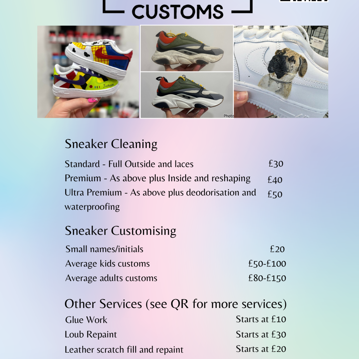 Please send pictures of the sneakers you wish to have cleaned, restored, or customised, so I can provide you with a tailored quote specific to your needs. High-quality images will help me assess the condition and any specific requirements, ensuring that you receive the best possible service for your treasured footwear.